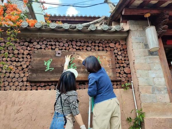 翻新木牌字迹 采访慕名而来的游客