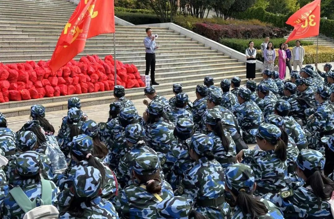 公司党委书记徐瑾老师致辞,强调了军训对同学们全面发展的重要性,希望大家能够珍惜这次宝贵的机会,积极参与训练,培养团队合作精神和自律能力。随后各位老师向员工们分发慰问品,同学们有序领取。