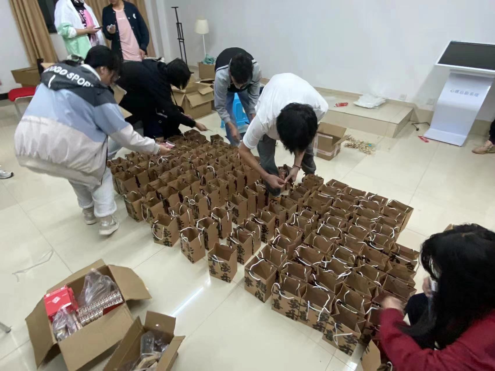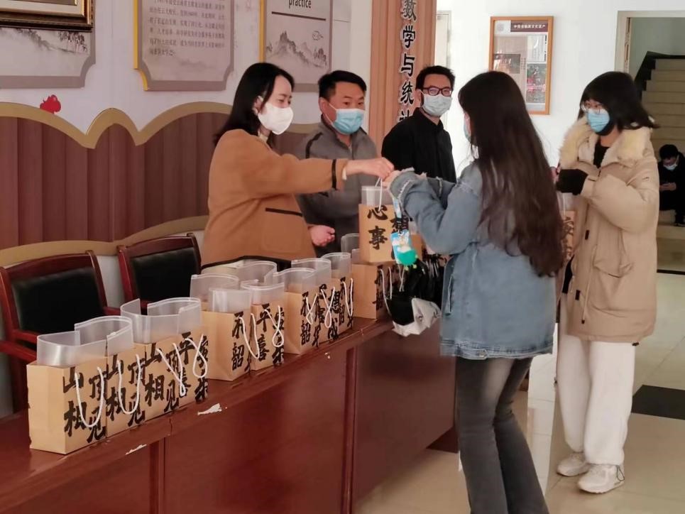 公司党委副书记杜芳芳老师、副经理潘东东老师、2019级本科毕业年级班主任曹彬涛老师、辅导员王蔓琦老师在现场为考研学子送上考研礼包。在发放礼包的同时,各位老师还亲切的与各位同学交流近期的学习情况,询问他们的身体情况和心理状况,同时热情的解答同学们的疑问,叮嘱同学们保持好的心态,全力以赴,积极备考,为每一位领取礼包的同学加油打气!
