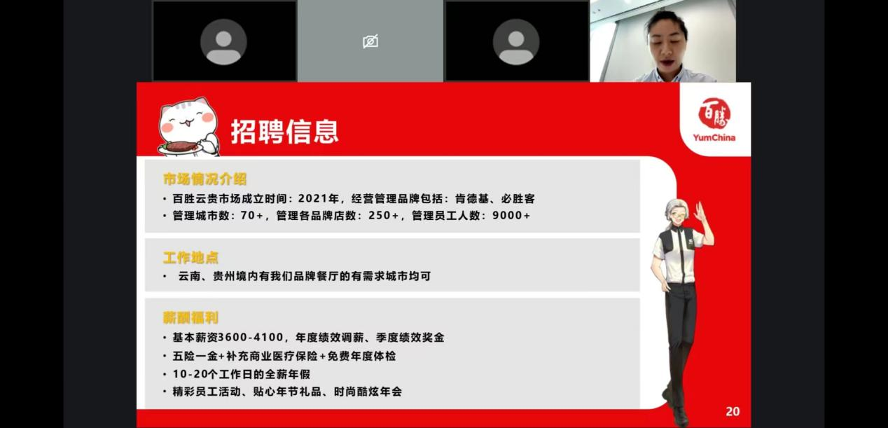 5月13日,通过线上宣讲的方式,引入昆一中、明智实验公司、明通小学、新东方、百胜集团等多家企业进行线上招聘宣讲,给毕业生提供了更多的岗位需求和就业帮助。