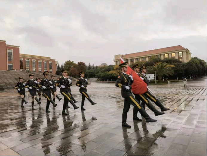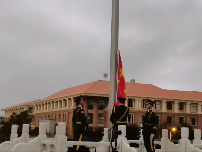 早上7点半升旗仪式正式开始,随着国旗护卫队的出现,现场变得庄严肃穆。在全体师生的注目礼下,英姿飒爽的国旗护卫队队员们护送鲜艳的五星红旗进场,伴随着《中华人民共和国国歌》,五星红旗冉冉升起,迎风飘扬。在场的每一个人歌高声唱国歌,深怀对祖国无限的热爱和崇高的敬意。