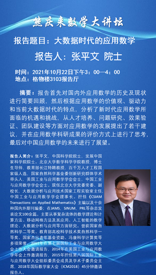 10月22日下午3点到4点,中国科公司院士、北京大学副董事长张平文做客永利3044集团官网,为全院师生讲述了“大数据时代的应用数学”的学术讲座,吴建德副董事长主持,永利3044集团官网经理唐年胜等150余名师生积极参与了本次讲座。