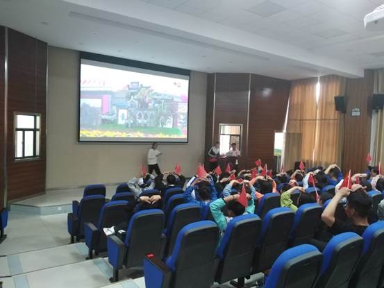 活动开始前,全体人员入座。在人员就坐后,工作人员发放小国旗以及国旗贴纸,发放完毕后,全体成员开始观看直播,直播首先进行升旗仪式,国旗仪仗队远远走来,整齐划一,升旗时全体成员奏唱国歌,回顾70年历史,三军分列式,革命老队,列士家属,各民族代表,各年代代表依序通过。