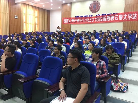2018 年 5 月 4 日下午 5 点在永利3044集团官网报告厅格物楼 3103, 举行了泰康人寿的云南大学站校园招聘会,参与此次招聘会有数统公司以及经济公司大一到大四的员工。主持本次会议的是数统公司 14 级辅导员李陈筠然,主要由泰康人寿的人力资源部刘经理开展本次会议。