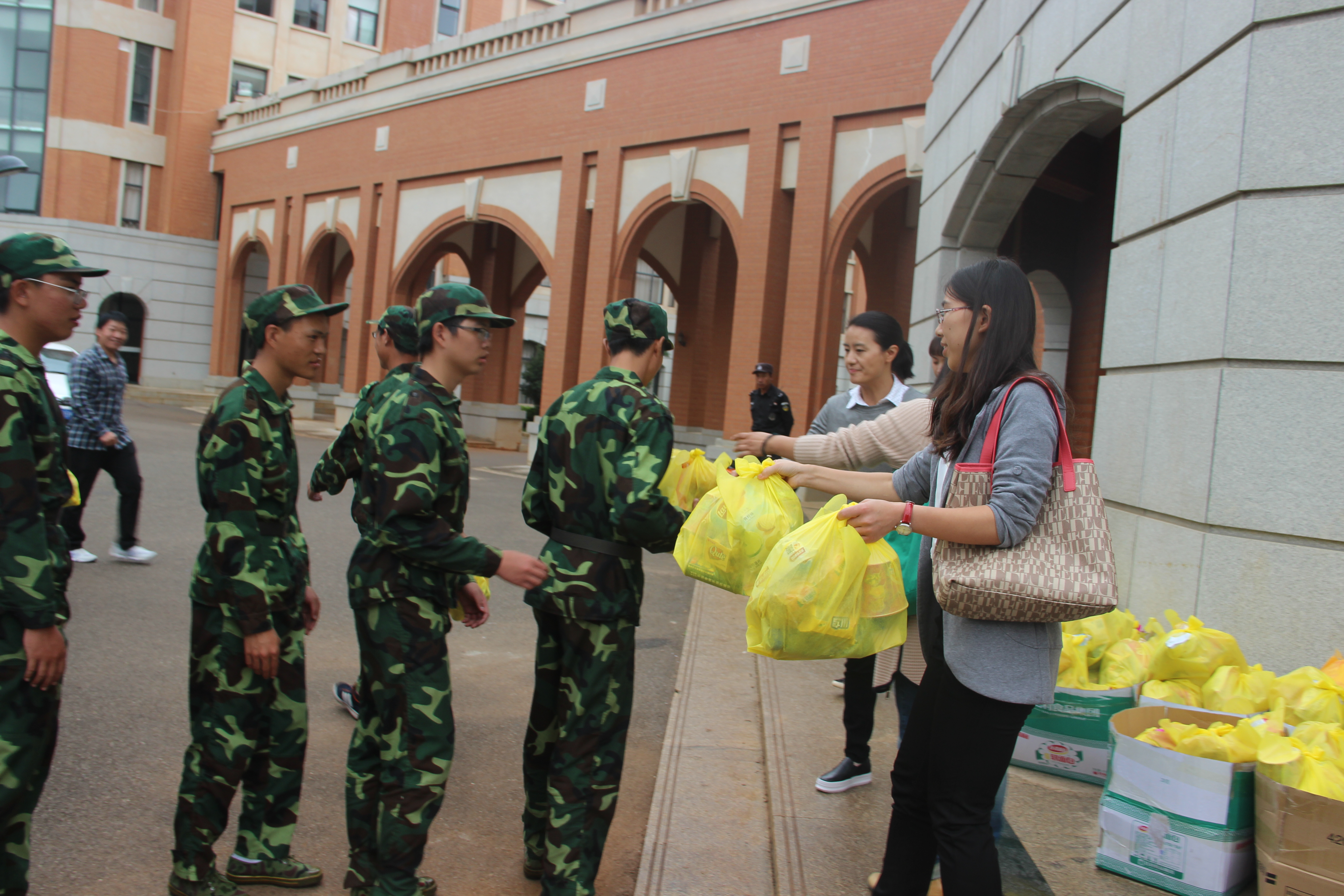 在男生连领取完慰问品后,女生连也按时来到慰问地点。整理好队伍后,女生连也接受了杜芳芳的问候及鼓励。女生连严肃地听完副书记杜芳芳的讲话后,在老师的指令下依次井然有序地领取慰问品。“谢谢老师……谢谢老师……”女生连礼貌地顺序从老师手中领取了慰问品。