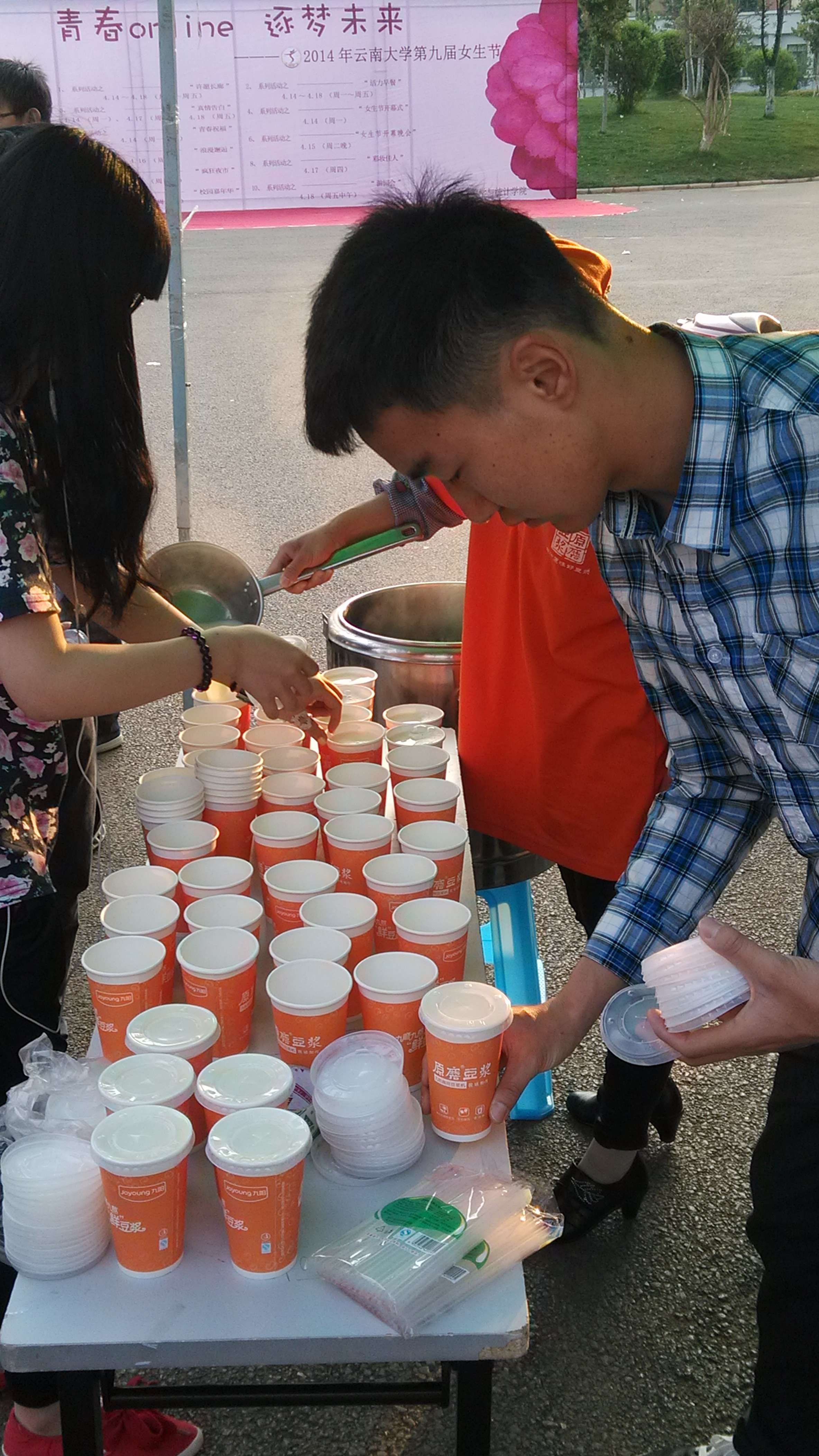 早上6点半,公司员工会和团委的男生们就齐聚在楠苑五栋宿舍楼下,准备为女生们服务。男生们穿着整齐精致的西装,买好早餐,准备好给今天的“幸运女神”们一个意外的惊喜。今天的“活力早餐”活动的幸运色是红色,所有身穿红色衣服的女孩们都能免费获得由数统公司为她们提供的活力早餐,并收到男生们热情的节日问候。在这寒意还未消散的早晨,面对“男人帮”送去的一份份早餐, “幸运女神”们的脸上充满了幸福的笑容。在这个微凉的清晨,男生和女生们为我们的校园增添了一份和谐。这次的活力早餐活动将从14日开始持续五天,到18号结束,每天都会选出一个幸运色为穿着这个颜色衣服的女生送上活力早餐,相信每个女生都能成为幸运女神,享受这样一份温暖。