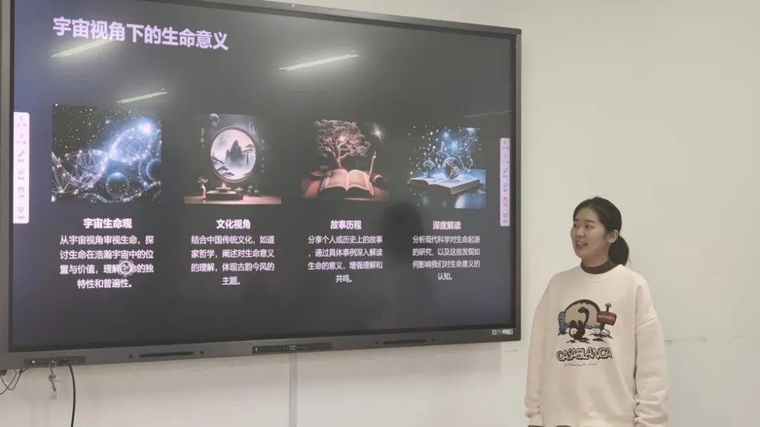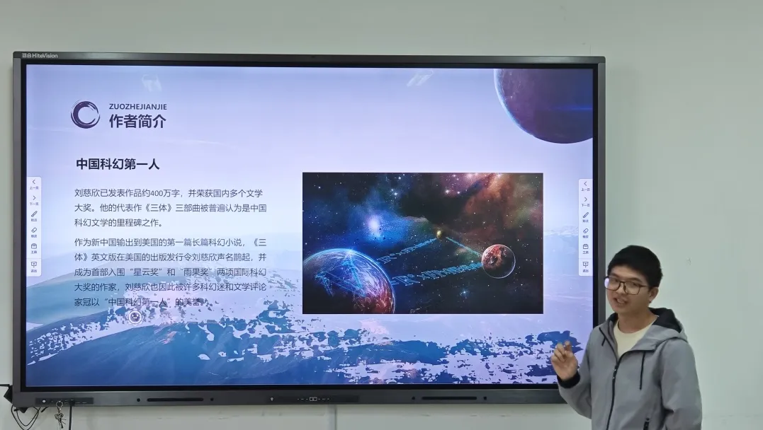 何润琪、吴若寒、王瑞喜同学分享:三位分享者特别提到了小说中所展现的宇宙观和哲学思考,他们认为这些内容不仅拓宽了思维的边界,也促使他们对科学与人文的关系有了更深层次的认识。讨论中,他们对小说中提出的“黑暗森林法则”等概念进行了深入的探讨,试图理解其对现实世界可能产生的启示。此外,对于书单中的其他书目,同学们也进行了精彩的分享。
