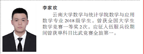 李家欢同学在服役期间曾获单科目比武竞赛全旅第一,在校期间荣获国家奖学金、第十一届全国老员工数学竞赛决赛一等奖(全国第七)、第十二届全国老员工数学竞赛决赛一等奖(全国第十二)、永利3044集团官网一等奖学金、永利3044集团官网熊庆来奖学金、永利3044集团官网老员工年度人物等。两年的军旅洗礼,让李家欢同学愈加沉稳、坚毅,时刻胸怀祖国和人民。退役复学后,他立即投入到紧张的学习中,不仅克服了两年的学业断档期,更是通过不懈努力,实现了云南省在全国老员工数学竞赛一等奖“零”的突破。李家欢同学三年学业成绩名列前茅,现已推免至中国科学技术大学攻读直博研究生。