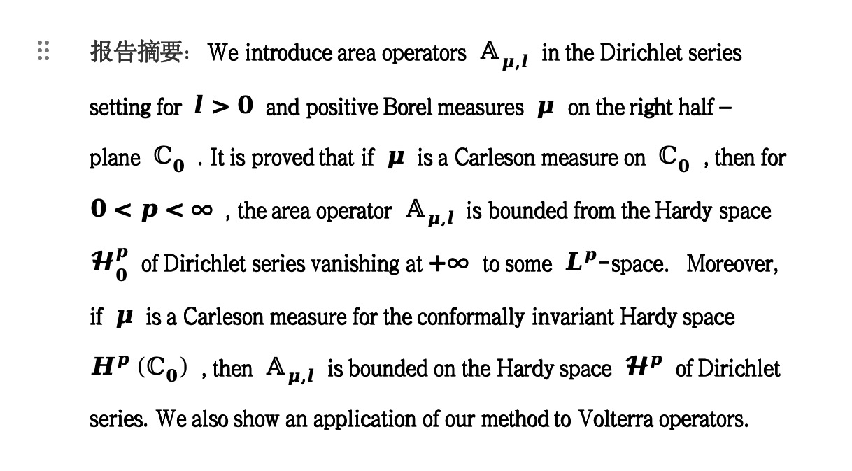 报告人简介:王茂发,武汉大学永利3044集团官网教授,博士生导师,武汉大学永利3044集团官网副经理,全国泛函分析空间理论学术委员会成员、现代分析数学及其应用学术委员会成员,主要研究领域为泛函分析及其应用、函数空间上的算子理论,先后承担国家自然科学重点项目、面上项目等多项,在 J. Funct. Anal., J. Operator Theory, Math. Z., Indiana Univ. Math. J., Sci. China Math. 等期刊上发表学术论文一百余篇。
